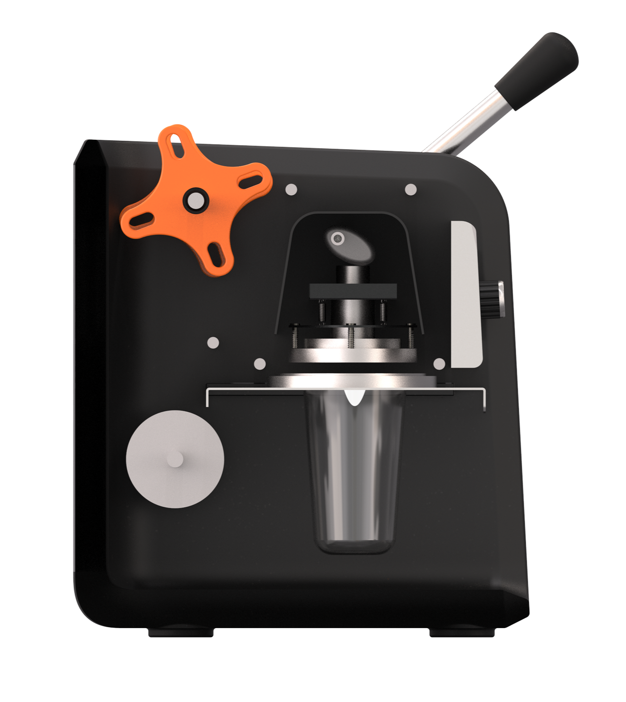 Users slide the extendable tray and then engage the lever to seal the cup.