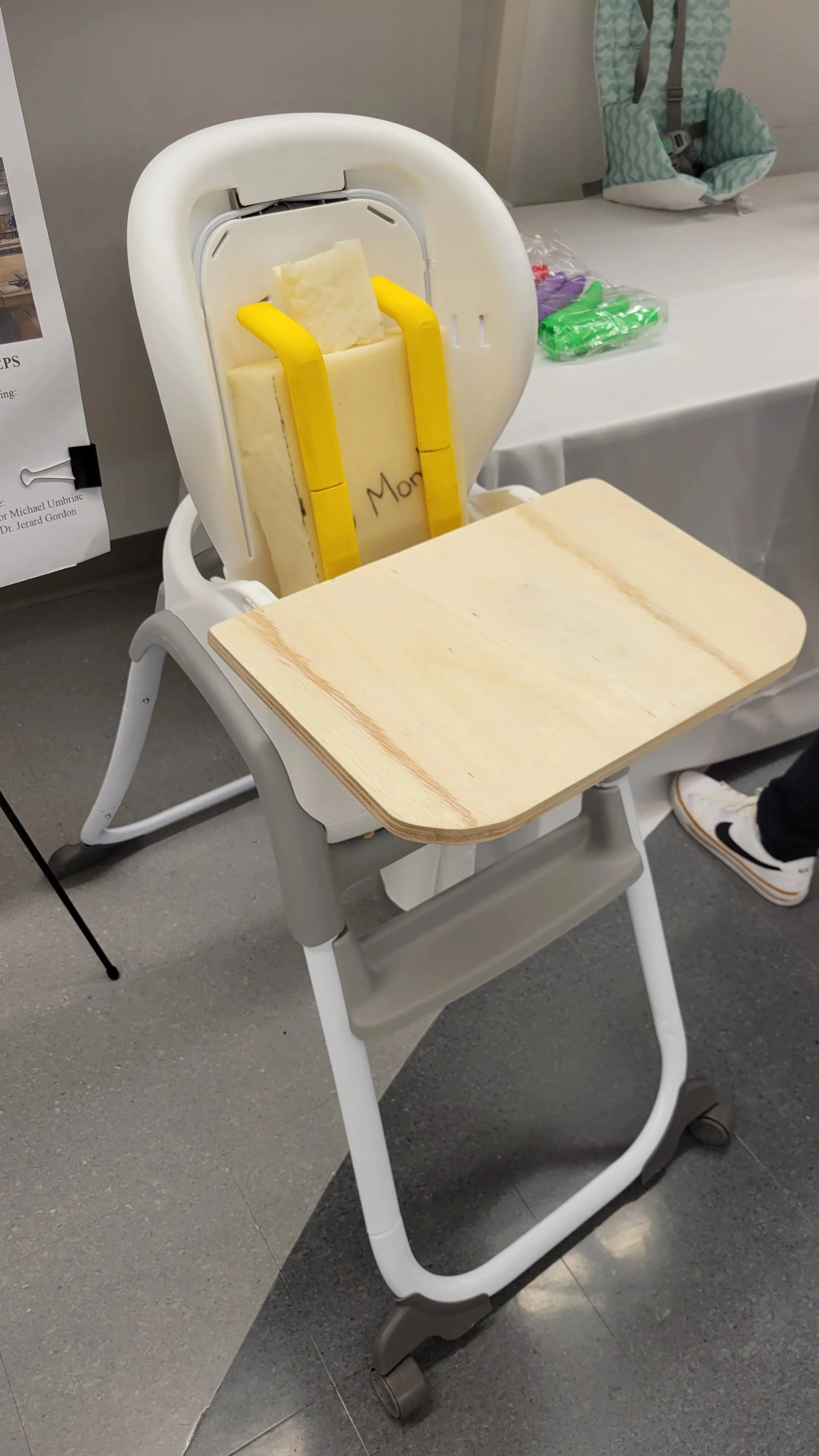 We purchased an affordable high chair and some flexible material to experiment with different restraint shapes.
